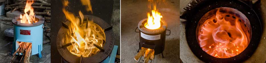 Each stove is designed to burn the fuel (wood or loose biomass) as completely as possible by optimizing the internal geometry and the air-to-fuel ratio. The area of contact between the hot flue gases and the vessel to be heated is maximized in order to increase the Useful heat. A specific design of the combustion chamber minimizes heat loss and reduce the risk of burning of direct fire.
